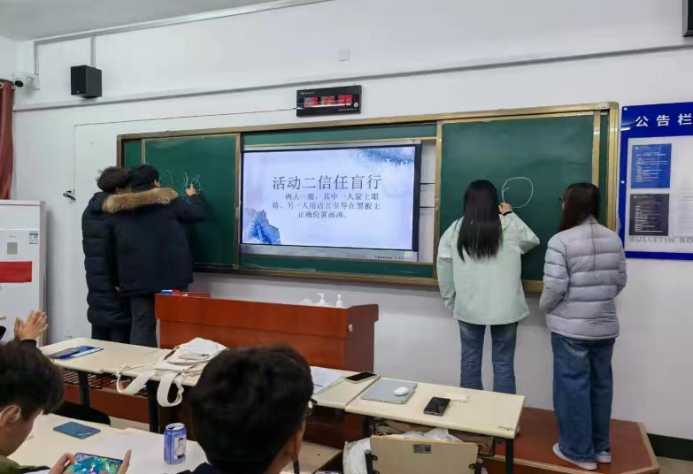 活动设置了“信任盲行”“共同绘画”等互动环节,引导同学们逐步卸下心理防御,在协作中建立信任、学会表达。欢声笑语中,初期的陌生与隔阂逐渐转化为理解与接纳。