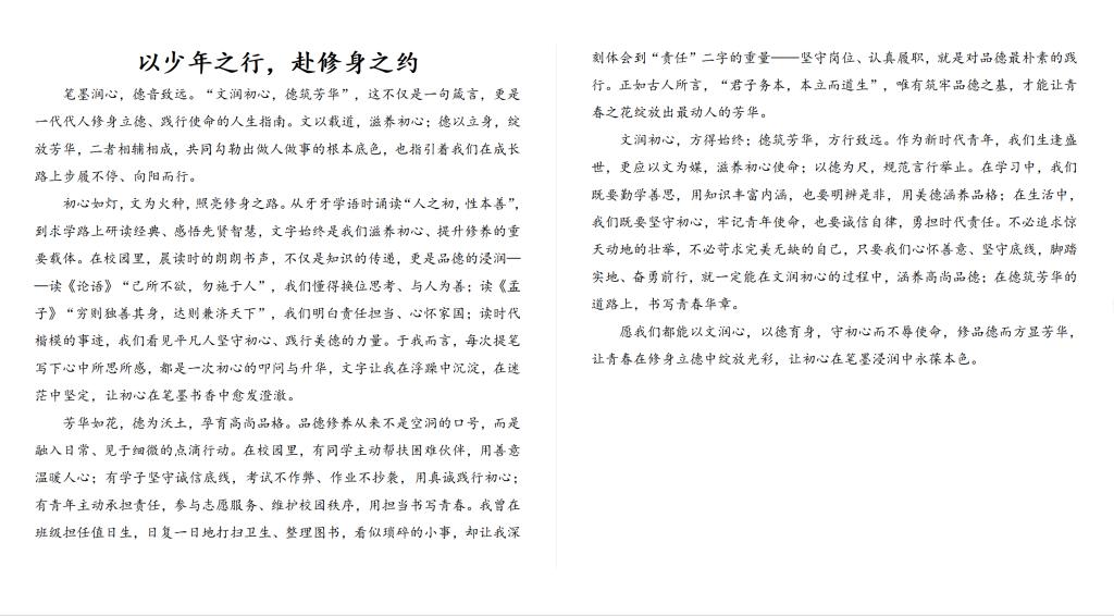 活动立足“道德修养”养成教育目标,面向全院全体学生开展线上原创作品征集,引导学生围绕品德修养、初心使命、诚信自律、责任担当、青春理想等主题方向,结合自身成长经历与校园生活展开创作,以文字书写感悟、以笔墨涵养初心,传递向上向善的价值追求。