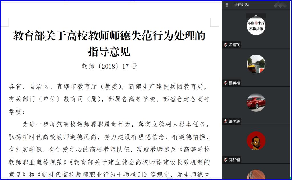 通过学习《教育部新时代高校教师职业行为十项准则》、《yl7703永利集团教师职业行为准则》等文件,反映学校对进一步规范教师履职履责行为,落实立德树人根本任务,弘扬新时代教师道德风尚,努力建设有理想信念,有道德情操、有扎实学识、有仁爱之心的教师队伍的坚定信念,对师德违规问题“零容忍”,严肃惩处,“一票否决”的鲜明态度和坚定决心。各位老师通过交流研讨进行自查自纠,自警自省。会后,各位老师对学习及研讨内容进行了认真地总结,纷纷表示要坚守立德树人初心,坚持以德立身、以德立学、以德施教,做党和人民满意的“四有”好老师。