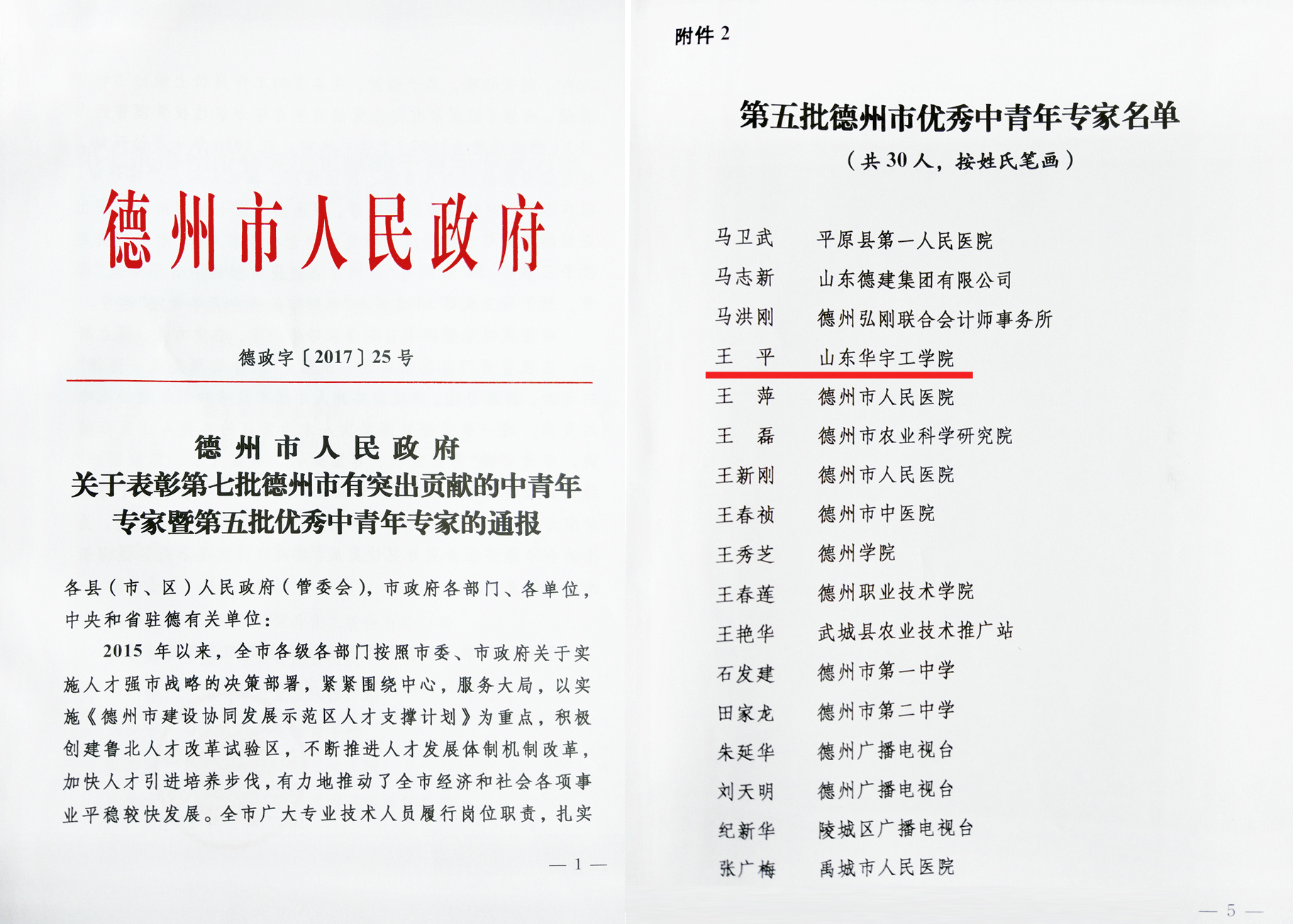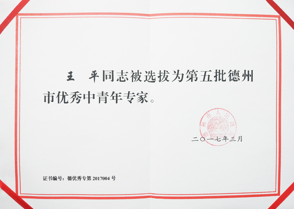 近日,在刚刚结束的德州市优秀中青年专家评选工作中,我院院长王平副教授荣获“第五批德州市优秀中青年专家”称号。