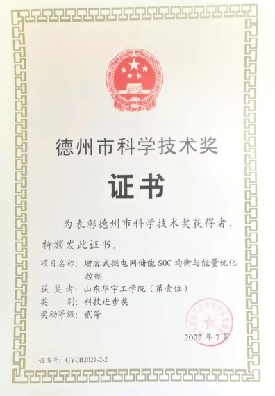近日,德州市人民政府发布了《德州市人民政府关于2021 年度德州市科学技术奖励的决定》(德政发〔2022〕8 号)。我院王爱岭副教授团队完成的“增容式微电网储能SOC均衡与能量优化控制”成果荣获德州市科技进步奖二等奖。