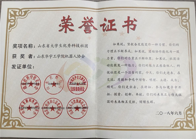近日,由山东省科协与山东省教育厅、共青团山东省委、山东省发改委、山东省经信委、山东省人社厅共同开展的2018年山东省大学生优秀科技社团和优秀科技社团干部评选活动圆满落幕。我院机器人协会被评为“2018年山东省优秀大学生科技社团”,王志港同学获“2018年山东省优秀大学生科技社团干部”荣誉称号。