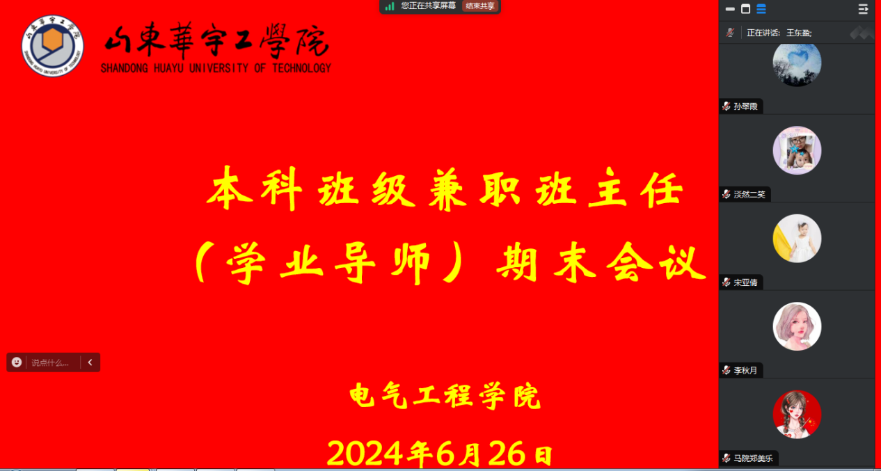 为总结本学期学业导师工作,进一步加强学业导师队伍建设,提高管理水平,保证管理成效,共同进步。yl7703永利集团于2024年6月26日通过腾讯会议召开了本学期本科班级兼职班主任(学业导师)期末会议,副院长王东盈出席此次会议,学院全体本科学业导师及辅导员参加。