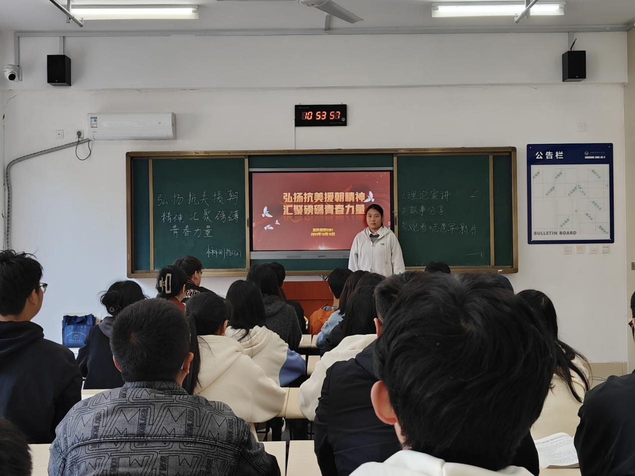 活动开始时,首先由各团支部团支书进行主题宣讲,讲述抗美援朝的背景、意义以及对中国的影响。鼓励团员青年发表感想和看法,让他们分享对抗美援朝的理解和感受,以激励与会的大学生们积极投身社会,肩负起责任。其次开展故事分享活动,同学们都积极地参与其中,使得同学们更加了解抗美援朝,更能清楚明白幸福和平的来之不易,增强同学们的爱国热情。最后各团支部一同观看了电影《志愿军:存亡之战》,通过影片让同学们更清楚地了解历史,铭记历史,同时激励同学们努力学习,发愤图强,报效祖国,守护好先辈们用鲜血换来的一切。