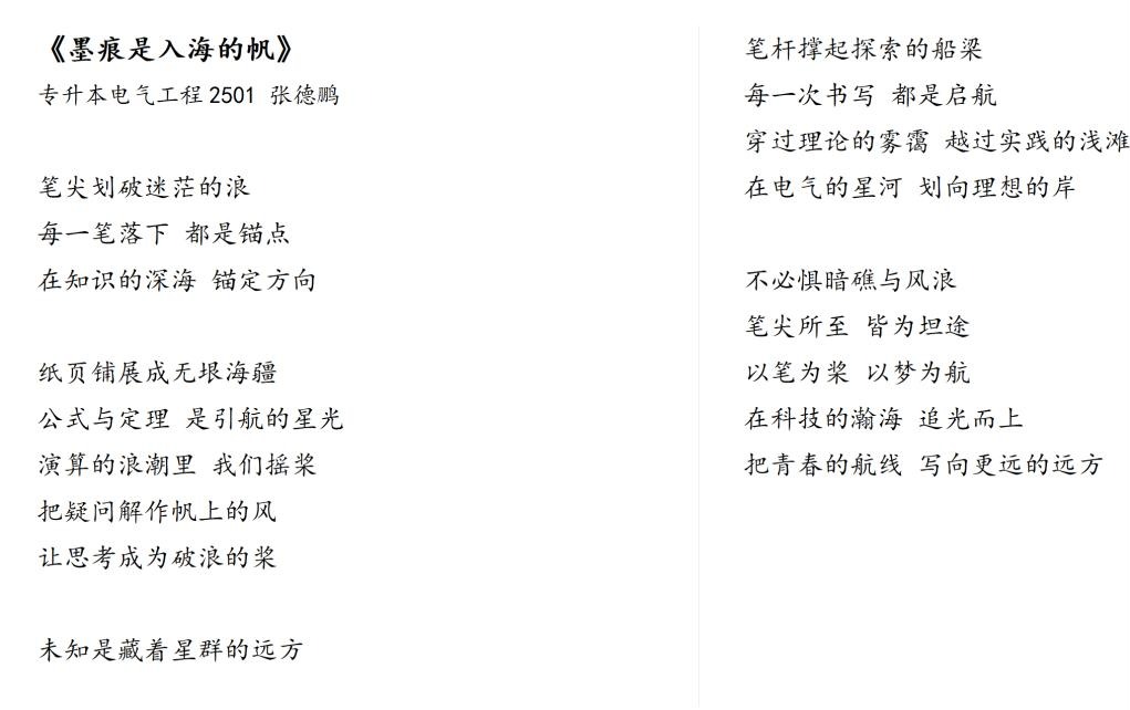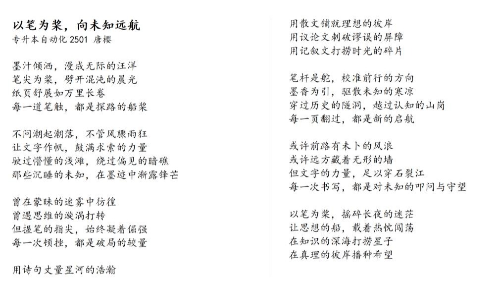 为深入落实“坚定文化自信,加强社会主义先进文化教育”的要求,积极响应学校“创新创业、沟通表达”等人才观培养理念,yl7703永利集团养成教育自治委员会于2025年11月24日至28日举办“以笔为桨・向未知远航”第四期校园诗歌创作活动。
